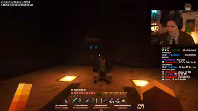 01:40:26Es wird ein Hustenanfall erwähnt, und die Luft wird als dünn empfunden. Es wird beschlossen, von ganz oben zu suchen und sich dann nach unten zu kämpfen. Es wird ein Vergleich zum Himalaya gezogen. Der Wunsch nach Dunkelheit wird geäußert, um Fackeln besser sehen zu können. Es wird spekuliert, dass am Ende nicht Pablo, sondern der Fanta Bumser wartet. Es wird beschlossen, etwas zu essen, und Schritte sind zu hören. Es wird nach Pablo gerufen. Es beginnt das erste Rätsel, bei dem das Gedächtnis auf die Probe gestellt wird. Die Zuschauer werden um Hilfe gebeten. Es wird erwähnt, dass keine Blöcke abgebaut werden dürfen, außer Dioritblöcke, um in den nächsten Raum zu gelangen. Es werden schlimme Erinnerungen an Dioritblöcke erwähnt. Es wird gefragt, welcher Block bei der Prüfung bußfertiger Mann erhalten wurde: Lapis Lazuli, Smart Block oder Diamant Block. Es wird festgestellt, dass keine Spitzhacke mitgenommen wurde. Es wird versucht, den Dioritblock abzubauen, und es wird festgestellt, dass dies schnell geht, da die Spitzhacke krasse Sachen hat. Ein neues Buch wird gefunden.