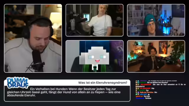 01:46:38Die Diskussion über das „Eieruhren-Syndrom“ geht weiter, wobei der Hinweis auf Martin Rütter die Teilnehmer auf die Tierwelt, insbesondere Hunde, lenkt. Kevin vermutet, dass es um das empfindliche Gehör von Hunden geht, was jedoch verneint wird. Basti kommt der Lösung näher, indem er über die innere Uhr von Hunden nachdenkt, die sich Zeiten merken können, ohne auf eine Uhr zu schauen. Kevin präzisiert, dass Hunde sich an wiederkehrende Ereignisse zur selben Zeit erinnern können. Dominik bestätigt dies als die richtige Antwort und erklärt, dass es sich um ein Verhalten bei Hunden handelt, die beispielsweise anfangen zu fiepen, wenn es jeden Tag zur gleichen Uhrzeit Gassi geht, wie eine ablaufende Eieruhr. Die vierte Frage lautet: „Was ist ein Goldfischglas im Büro?“ Kevin schlägt vor, dass es sich um einen offenen Bürobereich ohne Trennwände handelt, in dem jeder alles sehen kann. Basti präzisiert, dass es sich um einen Meetingraum in der Mitte des Büros mit komplett verglasten Wänden handelt, in dem man wie in einem Aquarium beobachtet werden kann. Dominik bestätigt dies als die richtige Antwort und bezeichnet es als sehr unangenehm.