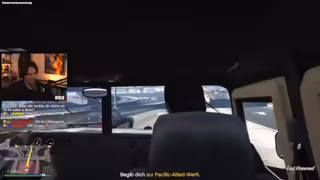 00:51:00Die Flucht im Zug erweist sich als überraschend effektiv, obwohl die Streamer unsicher sind, wohin die Fahrt geht. Max sorgt weiterhin für Chaos, indem er mit einem Benzinkanister hantiert und das Team zum Aussteigen drängt, um einen Laden zu sprengen. Nach dem Verlassen des Zuges und der erfolgreichen Zerstörung des Ladens finden sie ein vorbereitetes Fahrzeug, das sich jedoch als Zweisitzer herausstellt. Nach weiteren chaotischen Szenen und einer Verfolgungsjagd mit anderen Spielern erreichen sie ihr Ziel. Die nächste Mission ist es, zur Pacific Light Werft zu fahren und das Gebiet vor dem Handel zu fotografieren. Max' provokantes Verhalten und die dynamische Interaktion zwischen den Streamern, insbesondere die 'Bruder-Dynamik' zwischen Max und dem Streamer, prägen weiterhin den Verlauf des Spiels.
