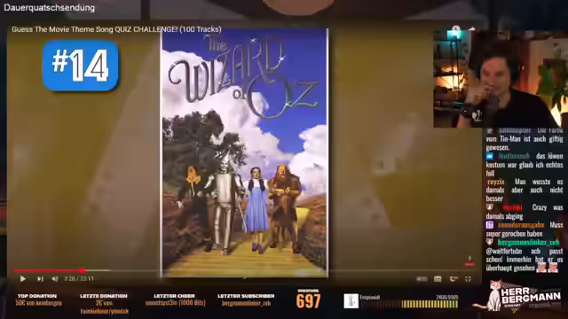 01:42:03Nach einer kurzen Pause wird das Filmemusik-Quiz mit den Jungs fortgesetzt. Es werden verschiedene Filmtitel und Soundtracks erraten, darunter 'A Star is Born', 'Toy Story 3', 'Guardians of the Galaxy' und 'Black Panther'. Es kommt zu Diskussionen über die Komponisten der Soundtracks, insbesondere Danny Elfman, der sowohl das Spider-Man-Theme als auch das Man in Black-Theme komponiert hat. Es wird kurz über den Film 'Man in Black International' gesprochen, der jedoch nicht an die Originalfilme mit Tommy Lee Jones und Will Smith herankommt. Es wird der Wunsch nach einem Club geäußert, in dem man zu solchen Soundtracks tanzen kann. Es werden weitere Filmtitel erraten, darunter 'Frozen Empire', 'Madagaskar', 'Despicable Me' und 'Findet Nemo'. Abschließend kommt es zu einer Sub-Bomben-Eskalation im Chat, bei der mehrere Zuschauer großzügig Subs verschenken.