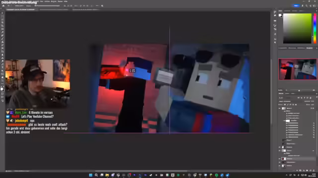 02:37:47Um dasThumbnail fertigzustellen, bittet der Streamer die Community aktiv um Hilfe. Im Discord-Server wird nach Hintergründen aus Bastis Basis gesucht, um authentischere Szenen zu schaffen. Ein Community-Member, Conex, liefert passende Hintergründe, die den Prozess beschleunigen. Der Streamer führt manuelle Nachbearbeitungen in Photoshop durch, wie das Hinzufügen von roten Lichtreflexionen, Konturen und dem finalen Namen-Tag, um das Thumbnail abzurunden.