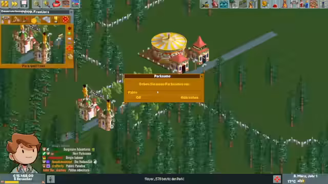 00:18:17Der Streamer beginnt, den Park konstruktiv aufzubauen, indem er Wege, Attraktionen und Eingänge strategisch platziert. Es werden erste Herausforderungen deutlich, wie die Verwirrung der Besucher über nicht funktionierende Wege und das Problem, dass der Park noch nicht geöffnet ist. Der Name des Parks wird in Abstimmung mit dem Chat festgelegt und als 'Pablo Land' benannt. Die Besucherzahlen steigen und fordern den Streamer auf, das Parkmanagement schnell zu optimieren.