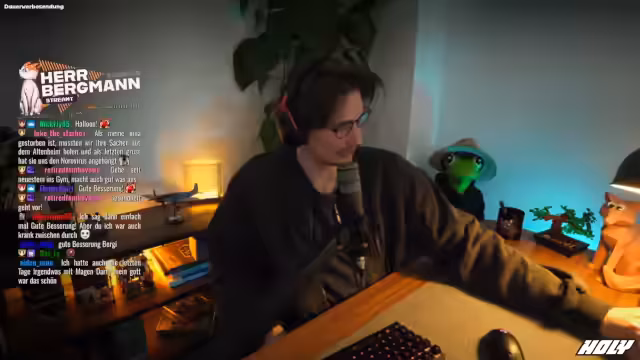 00:09:26Der Stream beginnt mit dem Streamer, der über eine schwere Erkrankung der vergangenen Woche berichtet. Nachdem er seine Mutter besucht hatte, kam es zu heftigem Erbrechen, Schüttelfrost und einem 24-stündigen Blackout. Eine Infektion mit dem Norovirus wird vermutet, was ihm den kompletten Streamplan hat durchkreuzen lassen. Während des Streams ist seine Stimme heiser, und er erwähnt weiterhin Probleme mit der Nahrungsaufnahme.