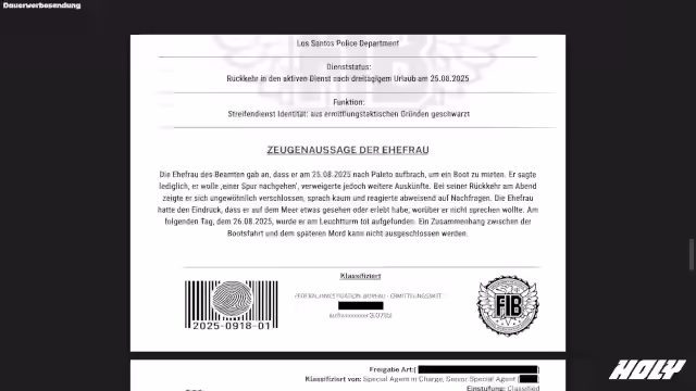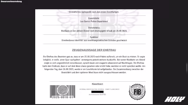 03:49:46Eine Ermittlungsakte über den ungeklärten Mord an einem LSPD-Beamten am Leuchtturm wird enthüllt, die vom FIB geführt wird. Die Akte enthält Classified Documents, was allein schon strafbar ist. Das Opfer wurde am 26.08. gefunden, und die Todesursache sind Schussverletzungen. Die Ehefrau des Beamten gab an, dass er am Tag zuvor nach Paleto aufbrach, um einer Spur nachzugehen. Der Verdacht kommt auf, dass die Akte zugespielt wurde, um vor weiteren Nachforschungen zu warnen. Die Zeitleiste der Ereignisse zeigt ein auffällig verschlossenes Verhalten des Beamten am Abend vor seinem Tod. Die Ermittlungen wurden vom FIB übernommen, und es wurden Reifenspuren festgestellt, die keinem Fahrzeug zugeordnet werden konnten. Die Dienstwaffe des Beamten wird vermisst. Es wird spekuliert, dass der Mord mit den Alien-Ermittlungen zusammenhängen könnte. Die Hypothesen deuten auf eine Falle am Leuchtturm und die Beteiligung von Tätern mit Kenntnis polizeilicher Strukturen hin. Die Akte schließt mit dem Ergebnis, dass die Tat gezielt gegen das Opfer in seiner Eigenschaft als Polizeibeamter gerichtet war.