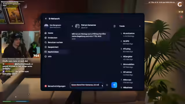 00:40:36Ein unvorhergesehener Anruf beim LSC-Salon löst eine Verwirrung aus. Eine Person namens Leo Baumann gab sich als Auftragsnehmer des Streamers aus, um an Fahrzeugdaten zu gelangen. Der Streamer erkennt den Namen nicht und erstattet umgehend Anzeige bei der Polizei, da er einen Betrugsversus wittert. Dieser Vorfall überschneidet sich mit einem Geschäftsvorfall, bei dem ein Mann beim Casino als angeblicher Marketingmanager auftaucht und eine Vorauszahlung von 15.000 Dollar annimmt, was bei den Geschäftspartnern zu Misstrauen und der Furcht vor einer Falle führt.