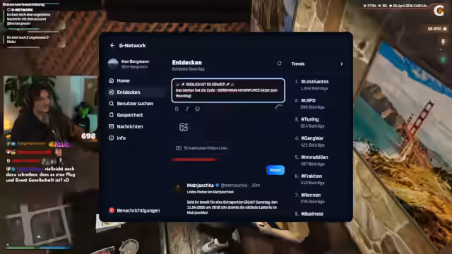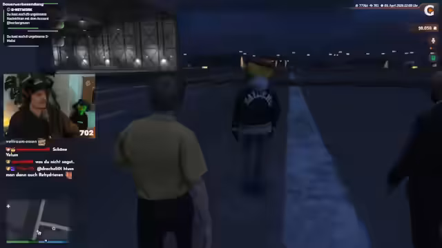 00:30:33Der Streamer interagiert intensiv mit dem Chat, begrüßt neue Follower, Prime-Subscriber und Spender. Er nutzt die Gelegenheit, den /rev 77764 Befehl auf dem GVMP-Server zu erwähnen, mit dem sich neue Spieler für den Anwerbebonus registrieren können. Dieser Bonus belohnt sowohl den Spieler als auch den Streamer mit 500.000 Dollar in der Gamescom. Zusätzlich kündigt er den Start seiner Fluggesellschaft an, deren erster Flug für Montag geplant ist, und stellt klar, dass alle Spenden direkt in dieses Unternehmen fließen.