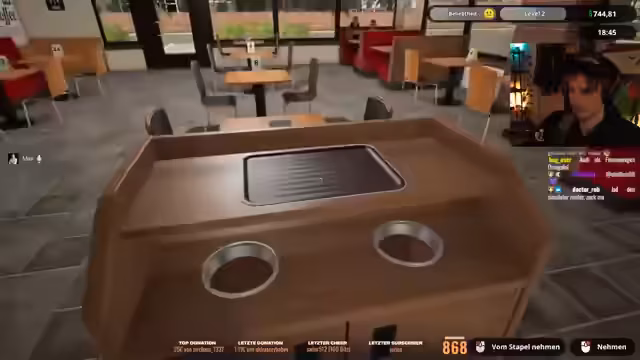 00:43:15Nach der Eröffnung des Restaurants läuft der Betrieb zunächst reibungslos. Der Streamer nimmt Bestellungen an und stellt Cheese- sowie Double Cheese-Burger her. Die Kunden reagieren positiv auf die schnelle und korrekte Zubereitung. Der Streamer gibt den Burgern Namen wie "Berger" und "Doppelberger" und genießt das überschwängliche Lob der Gäste. Er erwägt währenddessen, das Spiel später mit dem Stream "GTA Online" zu verbinden, um Überfälle auf das Restaurant zu ermöglichen.