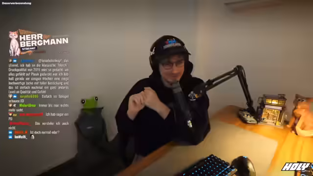 00:17:32Der Streamer freut sich auf die Rückkehr von Zero in Thailand im RP. Er erwähnt, ein günstiges Kissen bei Ikea erworben zu haben, und fantasiert über eine Merch-Aktion mit der Mütze an spektakulären Orten weltweit. Weiterhin wird die CI des Partners Holy gelobt, und er teilt eigene, noch unausgeführte Design-Ideen für Pablo-Cam-Merch. Persönlich berichtet er von einem Grippevirus-Vorbote und bewirbt die Merch-Tasse und -Mütze.