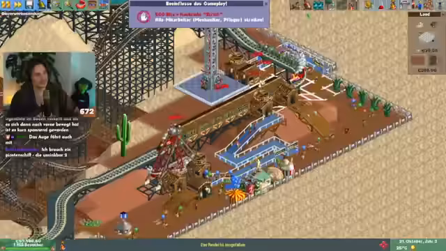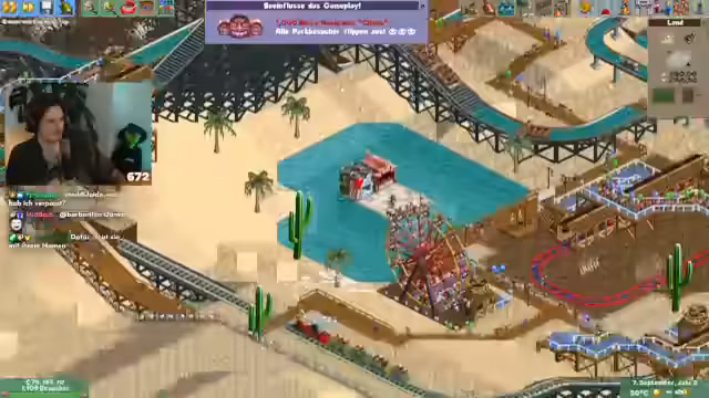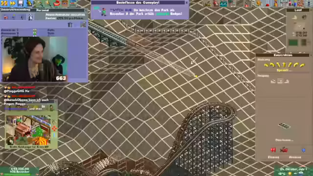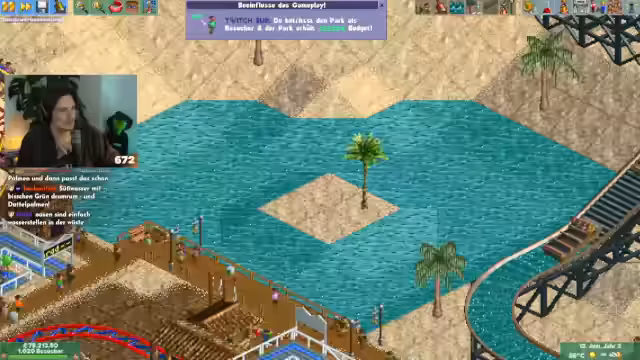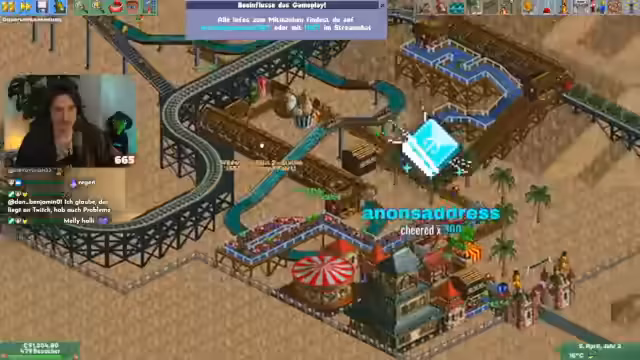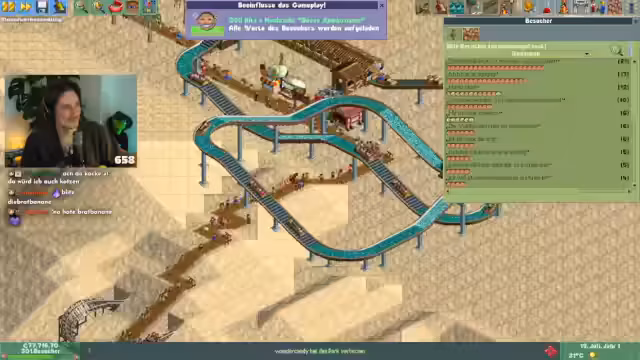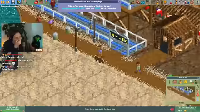 00:34:35Der Stream startet Rollercoaster Tycoon, nachdem es technische Probleme gab, die jedoch schnell gelöst wurden. Es ist das zweite Szenario, in dem alle neuen Features getestet werden. Subs tauchen sofort als Parkbesucher auf, wobei nur die beschenkten Personen, nicht aber der Schenker, im Park erscheinen. Der Streamer beginnt sofort mit dem Bau von Einrichtungen, um den neuangereisten Besuchern gerecht zu werden und deren Zufriedenheit zu gewährleisten.