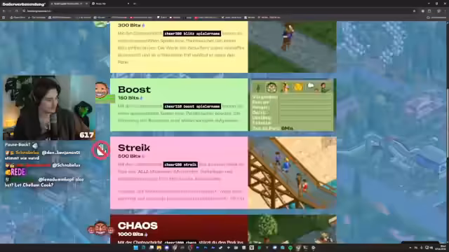 00:58:52Durch die kombinierte Aktion von Chaos und Streik steigt die Zahl der unzufriedenen Parkbesucher rapide an. Viele verlassen den Park, und die Zustände werden immer chaotischer. Der Streamer diskutiert mit dem Chat und dem Entwickler Klugey über technische Anpassungen für zukünftige Streams. Themen sind die Reduzierung von störenden Sounds, die Anpassung der Pop-up-Häufigkeit und die langfristige Entwicklung einer Funktion, um den Status der eigenen Parkbesucher zu verfolgen.
