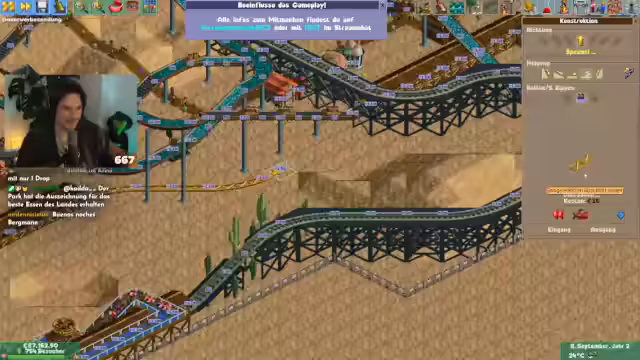 01:42:34Der Streamer arbeitet am kontinuierlichen Aufbau des Parks, indem er eine neue Achterbahn mit dem thematischen Namen 'Dynamite Blaster' errichtet. Gleichzeitig werden grundlegende Parkmechaniken wie Bahnübergänge im Open-Source-Projekt 'OpenRCT' vorgestellt und die Wichtigkeit eines durchdachten Wegesystems für die Parkbesucher betont, um Verwirrung zu vermeiden.