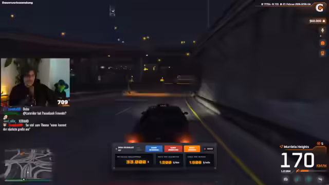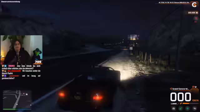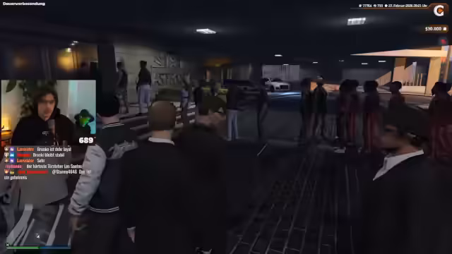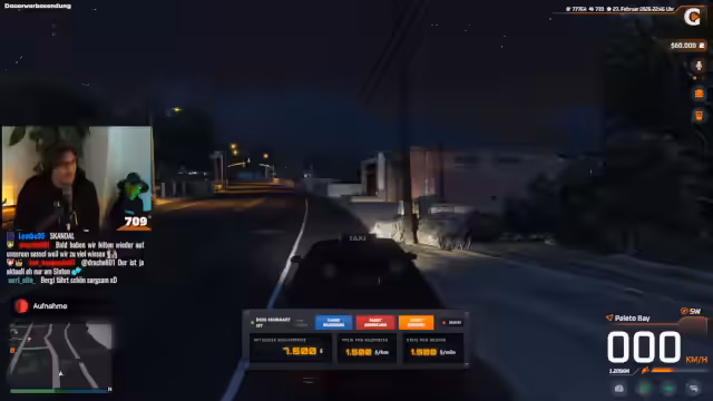 00:54:44Nach einigen Verzögerungen und technischen Unstimmigkeiten mit dem Fahrzeug erreichen die beiden den Nachtclub. Sie müssen feststellen, dass sie die Eröffnungsrede von Leo Wulff verpasst haben. Der Eintrittsvorgang gestaltet sich umständlich, mit einem kurzen Dialog mit dem Security-Personal. Sie betreten das Gebäude, um die Party im Club zu erleben, während der Streamer neugierig auf das Geschehen ist.