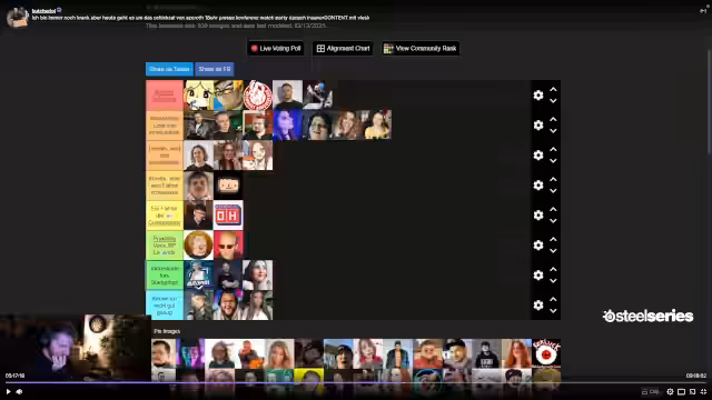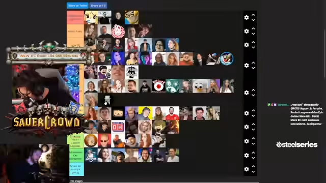 04:52:16Die Diskussion über den Profit für kleinere Streamer durch das Event wird fortgesetzt, wobei Beispiele wie Lord Pappnasa genannt werden. Es folgen konkrete Ranking-Einschätzungen: Holla und Apple Pie als Grinder, Vera als potenzieller Gesangs-Event-Highlight (falls sie Chancen nutzt), und Metashi als kontroverser Kandidat mit schwankender Performance (oft in Startgebieten stuck). Sein Skill-Level wird mit League of Legends verglichen, und er wird in 'Gilden-Carry' eingeordnet. Die Kategorien werden angepasst, etwa die Umbenennung zu 'Grinder wird beißen'. Auch der Unterschied zwischen Molten Core (Endgebiet) und Easy 60 wird klarifiziert.