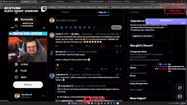 00:09:42Ein langjähriger Supporter namens Weibchen wird erwähnt, der seit 25 Monaten dabei ist. Es werden bekannte Namen wie Sandy, Deathsoldier und Chronic begrüßt. Das Gespräch dreht sich um bevorstehende Spiele-Updates, wie den neuen 'Cult of the Lamb'-DLC, die neue Season von 'Fortnite' mit dem Crown-Gem-Modus und die bald erscheinende Solo-Leveling-Kooperation. Der Streamer äußert auch seine Freude an der Story-Abteilung von Fortnite und ist gespannt auf die Rückkehr des Schiffs.