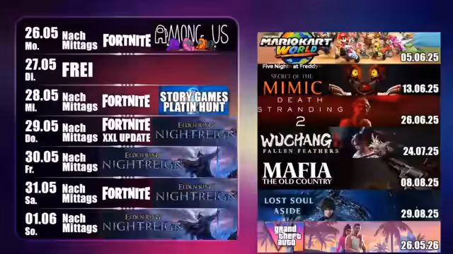 00:16:14Der Streamer gibt einen detaillierten Überblick über seine sehr volle Reiseplanung im Juni und Juli. Neben Festivals wie Rock am Ring und einem eigenen Grill-Event stehen persönliche Termine wie Geburtstage und Klassentreffen an, was die Verfügbarkeit für Streams stark einschränkt. Auch für August ist bereits eine Reise nach Amerika geplant. Die stark frequentierten Termine führen dazu, dass eventuell geplante neue Spiele wie Expedition 33 zunächst zurückgestellt werden, da sich der Aufwand nicht mehr lohnt, wenn die Season kurz danach startet.