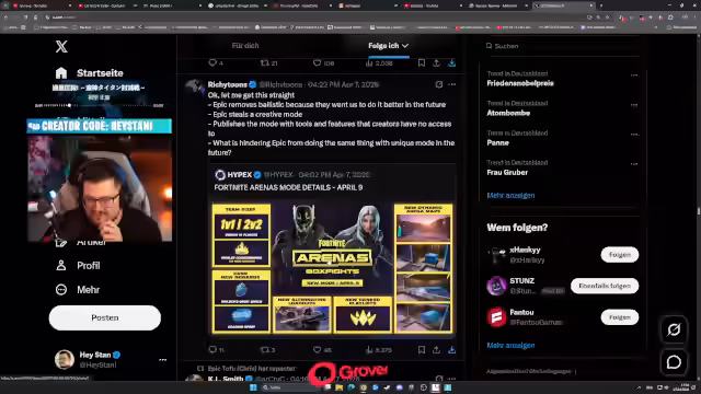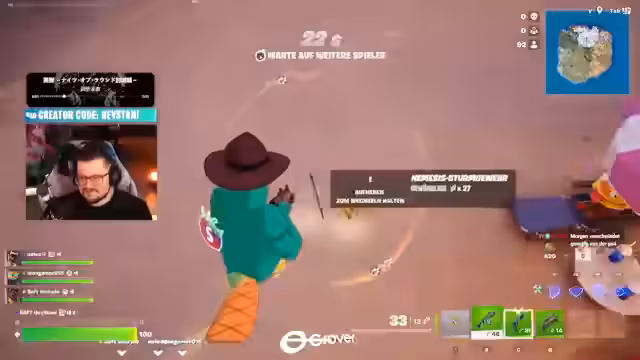 01:33:01Die Chatinteraktion dreht sich um die eigene Leistung in Fortnite, wobei der Streamer seine Position in der Showdown-Ranking-Liste als niedrig beschreibt und betont, dass er viel weniger spielt, angenommen wird. Er diskutiert mit dem Chat, ob er viel Fortnite zockt, was er verneint und erklärt, seine Spielzeit liege weit hinter vielen anderen. Außerdem wird auf den bald erscheinenden Arena-Modus in Fortnite hingewiesen.