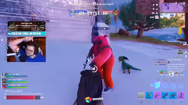 03:14:45Es werden massive Internetprobleme im Streamer-Haus festgestellt, das gesamte Internet hängt an einem einzigen Handy auf dem Dach. Der Streamer muss den Akku des Stream-Setups überprüfen, während er das erste Giveaway des Streams für David 97 auslöst und die universelle Nutzbarkeit der Guthabenkarten in allen Epic Games-Spielen erklärt.