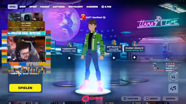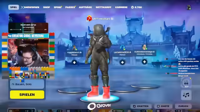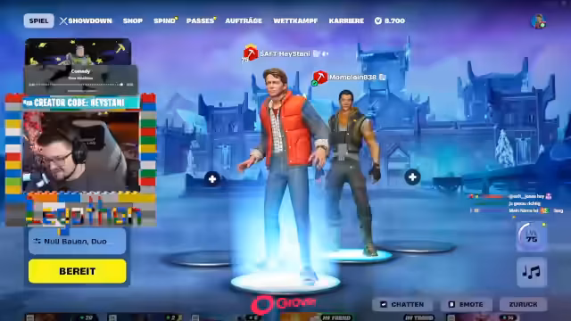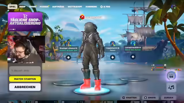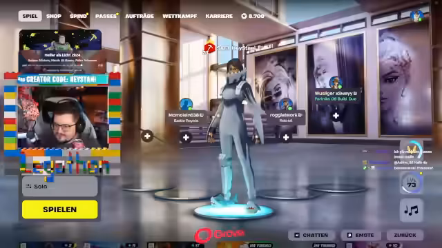 02:54:55Der Streamer wechselt nun zu Fortnite und beginnt, das Spiel zu streamen. Er startet einen gemeinsamen Chat und erwähnt, dass der Streamer bloody Zane nicht länger aushalten konnte und gejoint ist. Er lädt verschiedene Zuschauer wie Paul, Viefinger und Kalidor ein, ebenfalls beizutreten. Der Streamer erklärt, dass Fortnite mit einem No-Skin beginnt und dass Momo ein No-Skin ist und zunächst gegen Bots spielen wird. Er zeigt, wie man im Spiel einen Avatar ändern kann.