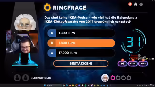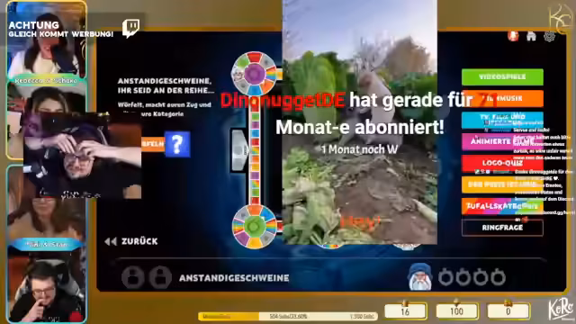 03:30:37Das Quiz beginnt mit einer Vorstellung der Spielmechanik, bei denen Teams auf einem Spielbahn-Feld vorankommen und Fragen beantworten müssen. Es besteht das Ziel, als erstes vier Ringe zu sammeln. Die Teilnehmer werfen virtuell Würfel und wählen Kategorien aus, wobei sie versuchen, strategisch günstige Felder zu erreichen. Gleichzeitig wird die technische Synchronität überprüft, da es zu Problemen mit der Bildschirmfreigabe und der Verzögerung bei der Übertragung kommt. Die Atmosphäre bleibt dabei trotz technischer Hürden spaßig und spannungsgeladen.