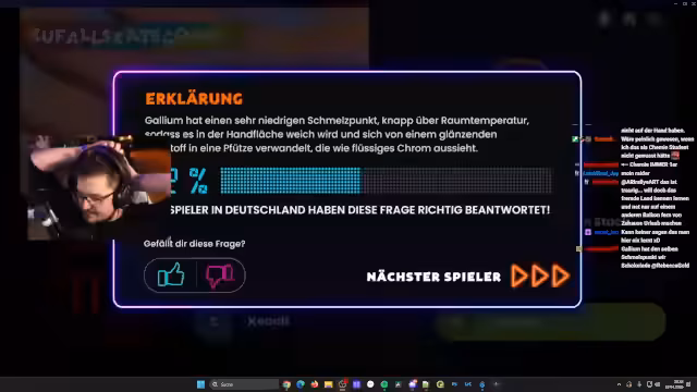 04:04:57Nachdem Stan und Nini über verschiedene Luxusmarken gesprochen haben, kommen sie auf eine Frage über das chemische Element Gallium, das sich in der Hand liquefakt. Stan hat Vorwissen und erklärt, dass Gallium Aluminium zerfressen kann. Es wird über schädliche Stoffe wie Quecksilber gesprochen, das früher auch für Kinder verkauft wurde. Die Teilnehmer sind sich nicht sicher, ob Gallium harmlos ist, und entscheiden sich dennoch für diese Antwort.