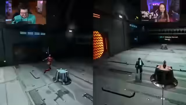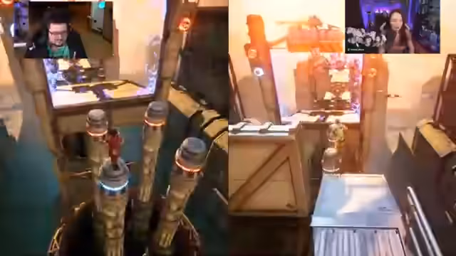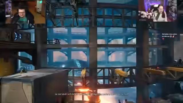 00:30:19Nach einer Pause mit technischen Anpassungen und Lästerei beginnt das eigentliche Gameplay von Split Fiction. Der Streamer und Vera spielen zusammen und entdecken die Science-Fiction-Welt des Spiels. Sie stoßen auf verschiedene Objekte und Herausforderungen, wie z.B. ein glitzerndes Portal, und beginnen, die Welt zu erkunden und Interaktionen mit der Umgebung zu testen.