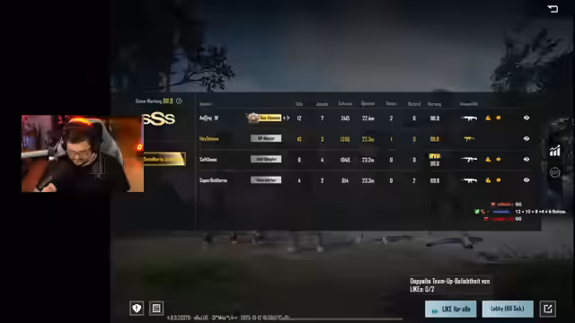 04:39:41Nach intensiven Runden in der PUBG Mobile Challenge gegen Asleaia Grover steht das Endergebnis fest. Das Gegnerteam erreichte in Challenge 1 177 und in Challenge 2 286 Punkte. Das eigene Team holte 194 Punkte in Challenge 1 und 186 in Challenge 2. Obwohl die Punkte in Challenge 2 um sechs Punkte falsch berechnet wurden, behielt das Team einen knappen Vorsprung von 23 Punkten und gewann das Battle. Das Preisgeld soll nun für Weihnachtsgeschenke verwendet werden.