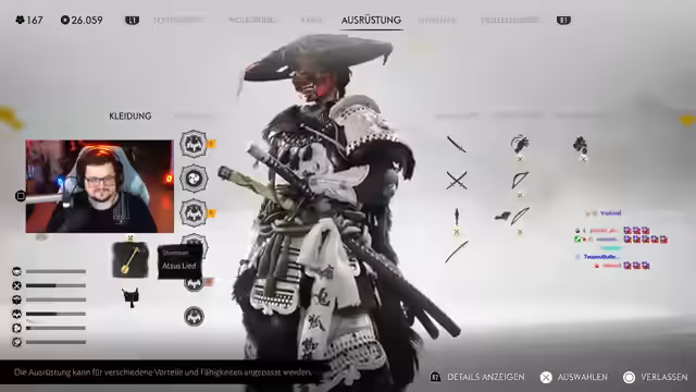04:45:06Der Stream wandte sich nach der Challenge dem Spiel Ghost of Tsushima zu. Ein neues Biom wurde erkundet, eine raue, grüne Landschaft, in der das Team eine Fähre bestieg und mit einer Figur namens Tucci interagierte, die vom Norden und den Ainu erzählte. Das Gameplay, besonders die cineastischen Kämpfe, wurde positiv hervorgehoben. Der Fortschritt im Spiel liegt bei etwa 50% der Platin-Trophäe.