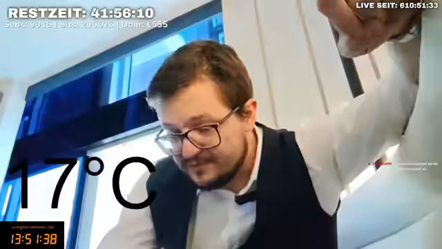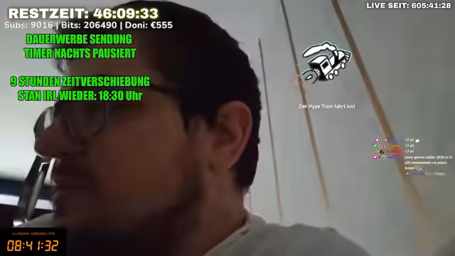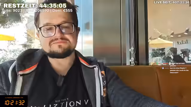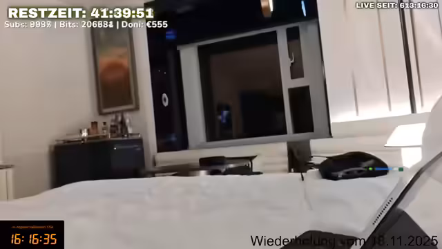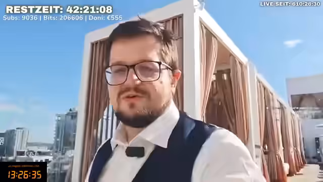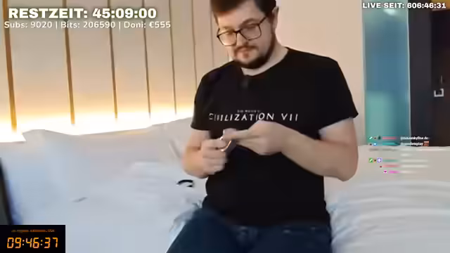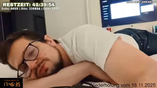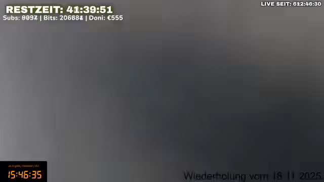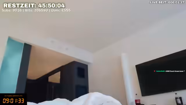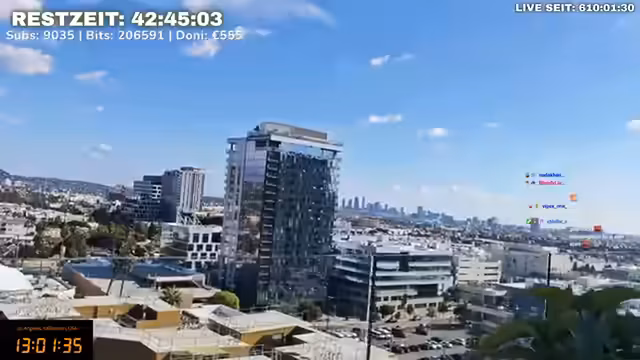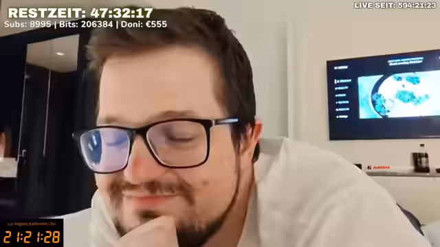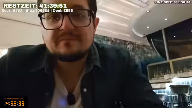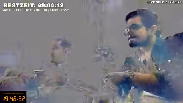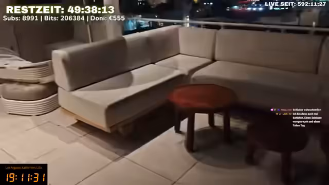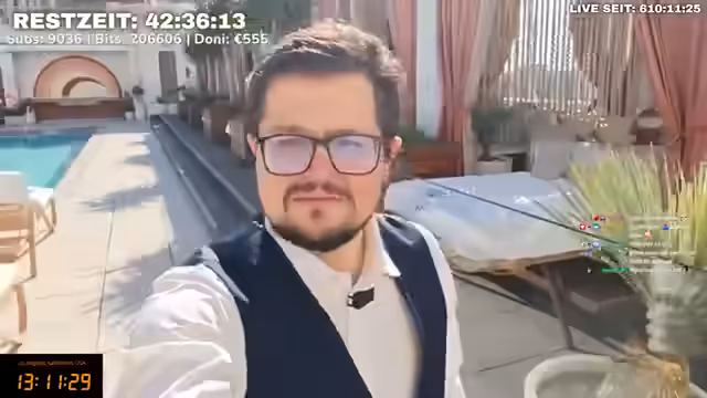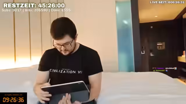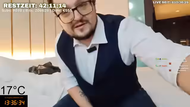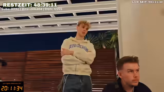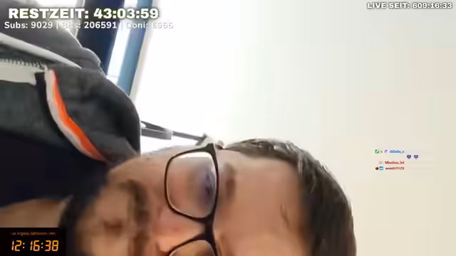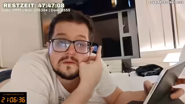 22:14:45Aufgrund eines Internetausfalls um 3 Uhr nachts (L.A.-Zeit) musste der Stream unerwartet neu gestartet werden. Dies führt zu der Notwendigkeit, in den nächsten Tagen einen Sonder-Neustart am Mittag zu machen, um die verlorene Streamzeit auszugleichen. Der Donnerstag um 15 Uhr wird als möglicher Termin genannt. Der Streamer ist seit fast 30 Stunden wach, befindet sich aber aufgrund der Zeitverschiebung immer noch im Dienstag. Er erwähnt, dass er in den kommenden Wochen viel unterwegs sein wird und "geheime Missionen" anstehen, die er noch nicht verraten darf, aber verspricht, die Zuschauer auf dem Laufenden zu halten, sobald er darüber sprechen darf. Ein Zuschauer hat ihn zufällig im Hotel in L.A. erkannt, was als lustiger Zufall beschrieben wird. Der Streamer überlegt, ob er einen Shopping-Trip am Donnerstag machen soll, da sein Koffer kaputt ist und er zusätzliches Gepäck mitnehmen kann. Er plant, den Pool auf dem Dach zu zeigen, da viele Zuschauer noch schlafen und es verpasst haben. Abschließend bemerkt er, dass das Internet im Hotel nicht optimal ist.