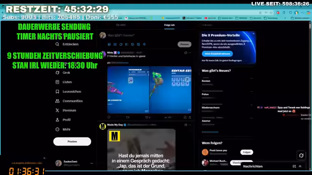 13:06:55Es wird diskutiert, wann Slasher den Stream übernehmen wird, da der aktuelle Streamer bereits seit 8 Uhr morgens Fortnite spielt und keine Lust mehr hat. Der Subathon wird voraussichtlich übermorgen enden, wenn Stan die ganze Zeit streamt. Es gibt Verwirrung über die genauen Zeiten, wann Stan übernehmen könnte, da verschiedene Angaben gemacht wurden. Es wird festgestellt, dass das Internet wieder funktioniert, nachdem es gestern Probleme gab. Der Streamer lehnt es ab, Undertale zu spielen, da es zu kurz ist, und möchte den Zuschauern auch nicht länger Fortnite zumuten. Er plant, die neue Map zu erkunden, um zu sehen, was es Neues gibt und welche Mechaniken an den verschiedenen Stellen der Map vorhanden sind, da viele Zuschauer dies noch nicht gesehen haben.