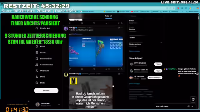 12:18:39Die Stimmung im Chat wird als ungewöhnlich ruhig wahrgenommen, was zu der Frage führt, warum 'Dan in L.A.' ist. Es wird angedeutet, dass Dan und andere Fortnite-Spieler geheime Projekte verfolgen. Der Streamer selbst fühlt sich heute 'ganz komisch', da er nur eine Stunde geschlafen hat, aber weder müde noch hungrig ist, sondern zu viel nachdenkt und sich nicht konzentrieren kann. Es wird der Vorschlag gemacht, eine heiße Schokolade zu trinken, um die Konzentration zu fördern. Persönliche Probleme werden angedeutet, wobei der Streamer sich eher enttäuscht als traurig oder sauer fühlt, was die Frage aufwirft, ob noch genügend Gefühle im Spiel waren oder ob es nur darum ging, nicht allein zu sein. Es wird spekuliert, dass es sich um einen Schockzustand handeln könnte und dass solche Beziehungen oft enden, wenn bereits vorher Anzeichen von Problemen vorhanden waren.