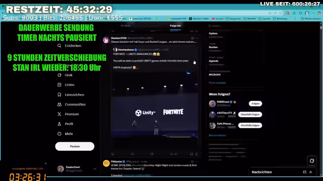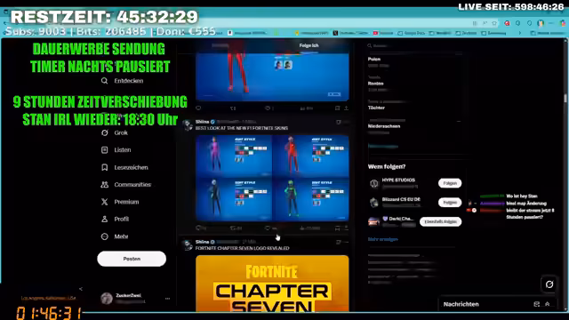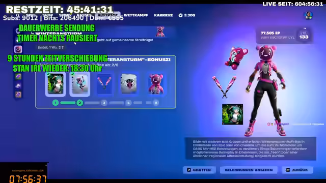 07:09:43Die Server sind weiterhin offline, und es wird spekuliert, warum sie an einem Mittwoch offline sind. Das Live-Event soll am 29. stattfinden, und ein Ingame-Timer zeigt noch 10 Tage an. Der Streamer erwähnt, dass er früher auch gestreamt hat und bei seinem ersten Stream alle zu Mods gemacht wurden, was zu lustigen Situationen führte. Er streamt jedoch nicht mehr und verweist auf Stan. Es wird über Winterrush-Aufgaben für einen Gratis-Skin gesprochen, der bis zum 18. Dezember verfügbar ist und das Zusammenspielen mit Freunden erfordert. Der Streamer äußert seine Abneigung gegen Creative-Modus. Es wird ein neuer 'Schwitzer-Skin' erwähnt und die Möglichkeit, dass ein Waschbär oder Hamster als Sidekick ins Spiel kommt. Die aktuellen Abo-Punkte von Stan werden mit 9978 angezeigt. Es wird darauf hingewiesen, dass man keine Freunde braucht, um den Skin zu erhalten, sondern einfach im Chat nach Hilfe fragen kann, was sogar zu neuen Freundschaften führen könnte. Ein Zuschauer berichtet, seine Freundin und Mutter seines Kindes durch Fortnite kennengelernt zu haben, sowie seine beste Freundin.