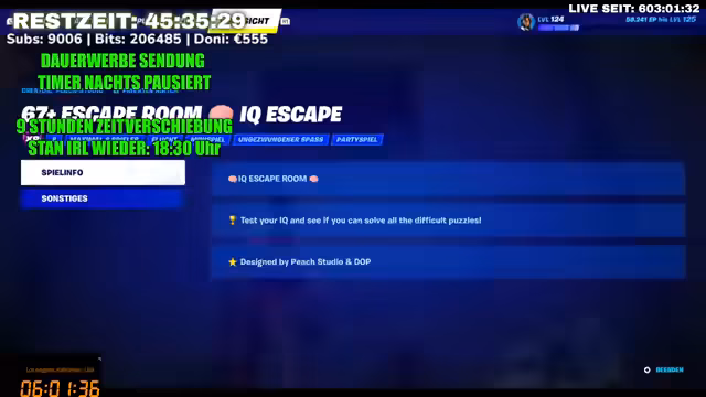 11:15:01Der Streamer beendete den Escape Room und stellte fest, dass er ohne Video die Lösung nicht gefunden hätte, insbesondere da die Spielmechaniken nicht wie erwartet funktionierten. Er bemerkte, dass die Map gut zum XP-Farmen geeignet sei, obwohl er selbst in dieser Season keine XP mehr benötigte, da er bereits Level 125 erreicht hatte. Es wurde über die verbleibende Zeit der Season (zehn Tage) und die wöchentlichen Aufgaben für die 'Professor-Banane' gesprochen. Die Frage, ob das neue Chapter getestet werde, wurde bejaht, wobei die Creator in L.A. Kato besuchen würden. Der Streamer scherzte über die Möglichkeit, dass Zuschauer, die von anderen Streamern kommen, die das neue Chapter testen, bei ihm einen Creative Escape Room sehen würden. Er berichtete von Lag-Problemen in seiner Lobby und fragte, in welches Level er als Nächstes gehen solle. Er fand einen Schalter und sammelte 20.000 EP für ein 5000 IQ-Level, was sich lohnte. Er erwähnte, dass das 1000 IQ-Level ein 'Only Up' mit aktivierter Kletterfunktion sei.