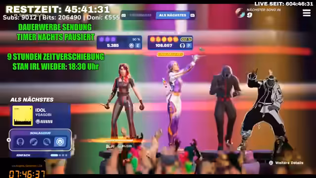12:46:50Der Streamer äußert seine Frustration über das Fortnite Festival, nachdem er sich darauf eingelassen hat, nur um einen Gratis-Skin zu erhalten. Er fragt sich, warum er das Spiel überhaupt spielt, wenn es keinen Spaß macht und seine Konzentration beeinträchtigt. Er erwähnt, dass es einen Teddy-Skin gibt und dass er das Spiel nur spielt, weil es keine EP gibt, wenn man einfach nur in der Lobby steht. Es wird überlegt, ob das Anmachen von Musik in der Lobby und das Herumstehen dort XP bringen könnte, aber dies wird aufgrund möglicher Audio-Überlappungen mit Spotify verworfen. Es gibt Berichte über Aufgaben, bei denen man zwei Lieder mit einem Instrument spielen muss. Der Streamer erlebt technische Schwierigkeiten mit seiner Elgato, die abstürzt, und es wird scherzhaft um ein Sponsoring von Elgato gebeten.