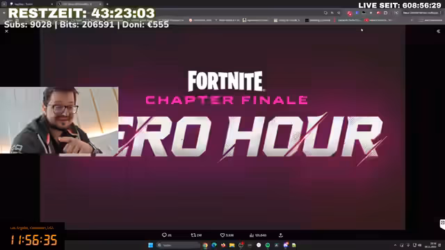 17:05:20Der Streamer reflektiert über die Schwierigkeiten, ein 10-minütiges YouTube-Video unter den gegebenen Umständen in Los Angeles zu produzieren. Er hofft, dass die Reaction trotz Verzögerungen gut funktioniert hat und lädt das Video hoch. Es wird erwähnt, dass er schnell seinen Cutter informieren muss. Die Tatsache, dass wichtige Ereignisse wie der Subathon und die Leaks während seiner Reise stattfinden, wird als "crazy" bezeichnet. Er plant, schnell einen TikTok-Clip zu erstellen. Die Diskussion dreht sich auch um die Glaubwürdigkeit von Leakern und Creatorn, die Informationen posten. Der Trailer für Fortnite Chapter 7 Live Event wird nochmals zusammengefasst, wobei die dunkle Präsenz, der Zero Point Splitter, Homer, Godzilla, King Kong, Star Wars X-Wings und Giant Homer als wichtige Elemente genannt werden. Kill Bill von Quentin Tarantino wird ebenfalls als großer Bestandteil von Chapter 7 hervorgehoben. Das Live-Event "Stunde 0" findet am 29. November um 20 Uhr statt, und die Zuschauer werden aufgefordert, zwei Stunden vorher in der Lobby zu sein, da die Server voll sein werden. Der Streamer befindet sich live in Los Angeles für ein geheimes Döner-Tasting mit Rubik's.
