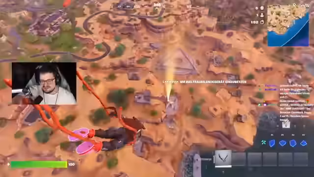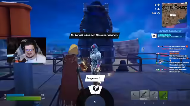 01:02:34Das spontane und unangekündigte Mini-Live-Event beginnt mit dem Comeback des Besuchers. Eine Rakete fliegt durch einen Riss und der Besucher landet punktgenau bei Classified Canyon. Im Anschluss daran erscheinen die Dialoge mit dem Besucher, der seine Rückkehr in das Fortnite-Universum erklärt. Er kündigt seine Verfolgung des dunklen Reisenden und dessen Zerstörung anderer Realitäten an. Das Event endet abrupt mit dem Verschwinden des Besuchers nach einer Raketenexplosion. Das Team sammelt direkt im Anschluss die Story-Aufgaben.