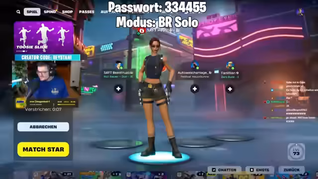 01:43:06Es wird ein Battle Royale Solo mit dem Passwort 334455 gestartet, obwohl die Lobby aufgrund von Gratasaufgaben möglicherweise nicht voll wird. In zwei Tagen werden die exotischen Waffen freigeschaltet. Die neue Lara Croft wird verfügbar sein, obwohl die alte Version bevorzugt wird. Der Jeep im Tomb Raider-Design wird als cool empfunden. Es wird erwähnt, dass Streamer beim Mitspielen oft von Zuschauern verfolgt werden. Die Aufnahme für Maxify war erfolgreich, da er nicht erkannt hat, dass es sich um das Gameplay des Streamers handelt. Es wird festgestellt, dass der Performance-Modus von Fortnite besser aussieht als erwartet, obwohl er normalerweise eine geringe Auflösung hat. Nach dem Tod in einer Runde wird eine neue gestartet, mit der Aufgabe, den Streamer zu beschützen.