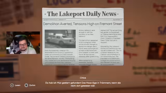 05:11:49Zu Beginn steht die Ankunft am Campus und das Wiedersehen mit alten Freunden. Nach einem kurzen Plausch mit chinesischen Zuschauern und dem Thema Jujutsu Kaisen wird das Gameplay fortgesetzt. Chloe sucht nach Informationen über den geplanten Abriss des Abraxas-Hauses und stellt Fragen zum historischen Ausschuss. Ein Bündel wird mitgenommen, als Warnung vor möglichen Eindringlingen. Im Verlauf der Konversation entdeckt Chloe den vermissten Gegenstand, den Maxi verloren hatte, und findet den Mut, um Professor Caulfield aufzusuchen und ihr ihr Kommen anzukündigen.