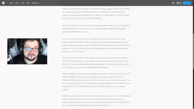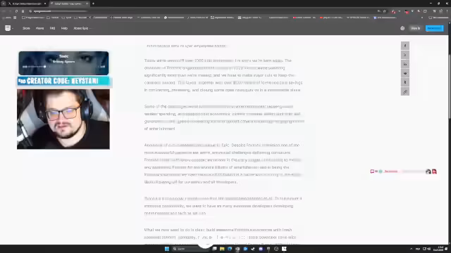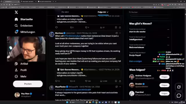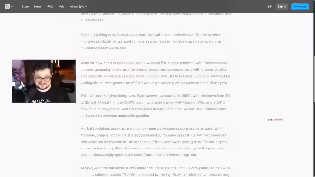 00:10:33Der Streamer diskutiert die Nachricht, dass Epic Games 1000 Mitarbeiter feuern wird. Er bezweifelt die anfängliche Meldung über die Mitarbeiterzahl und bestätigt später die Entlassungen als wahr. Er erklärt, dass es sich um eine Unternehmensstrategie handelt, die durch langsamere Wirtschaftswachstum und höhere Kosten verursacht wird. Er erwähnt auch die Entlassung des Senior-Programmierers Ivanosaurus.
