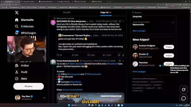 00:08:40Der Streamer konzentriert sich auf das Ausprobieren und Zocken neuer Items. Er erwähnt eine Baustelle hinter sich, die er einräumen muss, und benachrichtigt den Chat über eine Stufe 43. Er feiert den Geburtstag eines Chatmitglieds, der mit einer Stufe 43 zusammenfällt. Er beobachtet Chat-Nachrichten über Rocket Racing und die Feuern von 1000 Mitarbeitern bei Epic Games.
