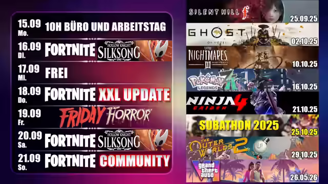 01:33:46Der Streamer erklärt, dass Twitch seine Haupt-Content-Plattform ist und er dort im Vergleich zu YouTube 10 Millionen Stunden an Content hat. Er rät einem Zuschauer, den Skin-Konsum zu reduzieren, wenn er jeden Monat 200 Euro für Fortnite ausgibt. Der Streamer findet die neuen Skins cool und erwähnt einen Megazord im orientalischen Stil. Mad Moxie wurde für den Itemshop aktualisiert. Der Streamer sieht in einem Skin eine Hollow Knight-Anspielung. Es wird eine WhatsApp-Umfrage gestartet, um den Lieblingsskin zu ermitteln. Der Streamer hofft auf originelle Fortnite-Skins und freut sich auf Kevin im See am 27. September. Nächste Woche stehen Silent Hill F und Borderlands Lahn an, was sehr stressig wird. Der Streamer wird für die Borderlands Lahn in Berlin unterwegs sein und dort mit Vincent Fellow und Prima Lavera zocken.