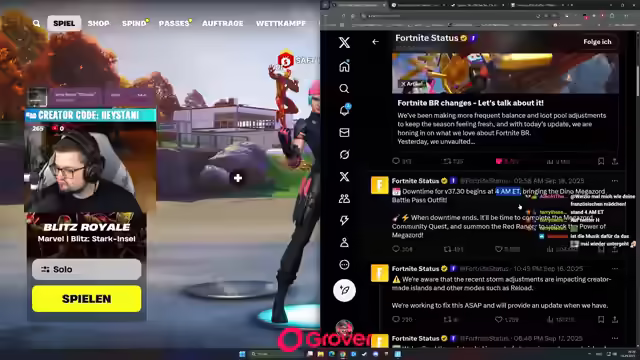 00:08:38Es wird über das XXL Update für Fortnite gesprochen, inklusive Megazord und Delulu Modus. Die Ankündigung des Updates erfolgte um vier Uhr morgens. Es wird spekuliert, dass Epic Games das Update unbedingt veröffentlichen musste, da bereits Trailer für Megazord und andere Inhalte angekündigt wurden. Es wird erwähnt, dass direkt Social Media Aktivitäten geplant sind, insbesondere das Erstellen einer Insta Story und Twitter-Posts, falls die Server down sind. Der Streamer erwähnt, dass er morgens mehr Zuschauer hat als abends, was er als positiv bewertet. Es wird auch überlegt, wann der Creator Code erneuert werden muss.