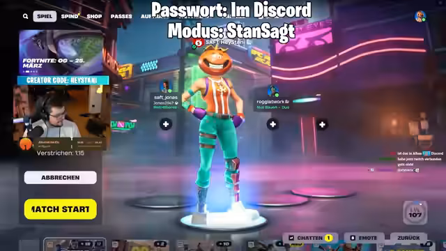 00:34:29Der Streamer begrüßt neue Zuschauer und erklärt, dass beim Community-Tag das Glücksrad über den nächsten Spielmodus entscheidet, um Abwechslung zu gewährleisten und Beschwerden vorzubeugen. Er betont, dass er dennoch die letzte Wahl hat, falls er keine Lust auf bestimmte Modi hat. Der Streamer ermutigt die Zuschauer, den Gamba-Emote im Chat zu verwenden. Das Glücksrad entscheidet über den nächsten Modus: Zero Build Trio. Das Passwort lautet 334455. Der Streamer bedankt sich bei einem Zuschauer für den 14. Monat und wünscht allen viel Glück. Er kommentiert, dass einige Zuschauer die Spiele zu ernst nehmen sollten und empfiehlt, es wie Terry zu machen, der einfach nur Spaß hat. Der Streamer erwähnt, dass er bald nach Singapur reist und noch nicht weiß, wie er dort streamen soll, da die Uhrzeit ein Problem darstellt. Er schlägt Singleplayer-Games als Alternative vor und empfiehlt Doom the Dark Ages. Der Streamer erklärt, dass er in Singapur nur eine Konsole zur Verfügung hat und verweist auf die Mitte des Bildschirms, wo der Code blinkt.
