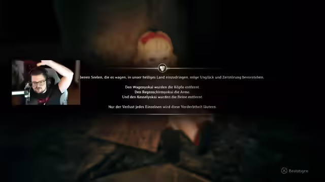 06:16:33Der Streamer äußert sich sehr positiv über das Spiel und freut sich, dass die Erwartungen erfüllt wurden. Die Atmosphäre und die Welt werden als gelungen gelobt. Es wird erwähnt, dass man unter dem Stream sehen kann, welche Kategorie eingestellt ist. Es wird überlegt, ob ein erster Bosskampf bevorsteht. Die Zeichnungen im Spiel werden als liebevoll gestaltet beschrieben. Es wird ein Schlüssel für Sakokos Briefkasten gefunden. Es wird überlegt, ob sich ein Backtrack lohnt. Es wird festgestellt, dass es sich um eine optionale Cutscene handelt, die man verpassen kann, wenn man direkt zu Rinkos Haus geht. Es wird erklärt, dass man mehr Schaden verursacht, wenn man den Fokus lange auflädt, was Waffenhaltbarkeit spart. Es wird überlegt, wie man zu Sakokos Leiche gelangt. Ein Brief aus dem Test-Ergebnis von Sakoko wird gefunden, in dem keine Auffälligkeiten festgestellt wurden. Der Streamer liebt das Spiel und findet es sehr liebevoll gestaltet. Es wird überlegt, ob es sich lohnt, noch weiter hochzulaufen, um etwas zu verkaufen. Es wird ein getrockneter Frosch erwähnt, den es irgendwo geben soll. Es wird überlegt, ob man einen Verband oder einen Erste-Hilfe-Kasten nutzen soll. Es wird überlegt, ob man beten soll. Es wird über Twitch als Plattform gesprochen und dass Twitch eine höhere Bildung und einen höheren Standard hat als die anderen Livestream-Plattforms. Es wird überlegt, was man mit den Kanalpunkten machen kann. Es wird der Frosch eingesammelt und der Pudding eingesammelt. Es wird kommentiert, dass man sich aus einem Grab nicht befreien kann. Es wird überlegt, ob man den Fokusangriff nutzen soll. Es wird gespeichert. Der Streamer ist viel am Einsammeln und Verkaufen. Es werden Werkzeug-Sachen gefunden. Es wird überlegt, ob man die Waffe reparieren soll. Es wird ein Bossfight erwartet. Es wird überlegt, ob man gegen den Boss kämpfen oder abhauen soll. Es wird überlegt, ob man Heal-Items nutzen soll. Es wird festgestellt, dass man nur einen einzigen Angriff kontern kann. Es wird ein Talisman gefunden, der beim Ausweichen den Schatten erheblich resistiert. Es wird ein Medikid weggeschmissen. Die Sichel hat ordentlich Power, verbraucht sich aber auch schnell. Es werden Pflaumen gegessen, die als eklig beschrieben werden. Es wird ein Items-Lot generiert. Es wird überlegt, ob man umziehen soll.