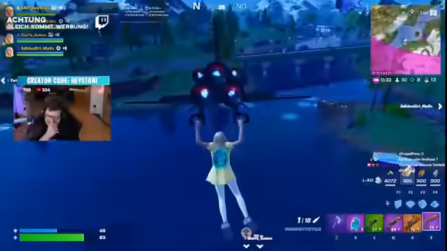 01:55:03Das Fortnite-Update wird vorgestellt, das einen neuen Gratis-Skin in den Battle Pass bringt. Dieser wird durch Leveln freigeschaltet und ist separat im Item Shop erhältlich. Die Ballistik-Spieler erhalten eine komplett neue Reload-Map, die für die nächste Woche angekündigt ist. Mit dem Update werden auch Inhalte aus Chapter 1 wieder eingeführt, beginnend mit einem Meteor-Live-Event. Die Ankündigung der Sabrina Carpenter-Kooperation und des dazugehörigen Festival Passes sorgt für große Begeisterung im Chat.