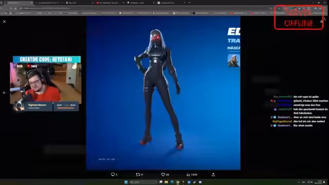 04:07:20Nachdem die Server für das Update offline gegangen sind, nutzt der Streamer die Wartezeit, um alle neuen Skins durchzugehen. Er zeigt die detailliertere Gestaltung der neuen Skins im Vergleich zu Chapter 1 und kritisiert, dass manche Skins, wie der Gartenroboter, wieder feststecken. Es werden auch vermehrt Remakes von alten Skins wie Midas und Killer Maus eingeführt, während gleichzeitig immer neue Originale hinzukommen, was selektive Wahrnehmung im Chat auslöst.