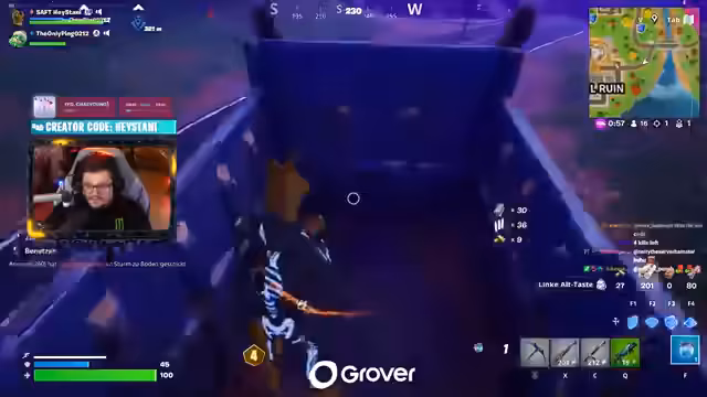 00:00:01Der Stream beginnt mit einem humorvollen Kommentar zu den Fortnite-Events, bei denen alle Bosse per One-Shot eliminiert werden. Der Streamer zeigt sich beeindruckt von der Spielmechanik, beschreibt aber auch, wie er versehentlich gegen eine Wand prallte und sofort starb. Die Stimmung ist heiter, mit Parodien über in Wände gespielte Archtecks und die Behauptung, Gegner würden "Leiche tragen" und "Komata auf 35ern im Hauch" machen. Der Streamer benennt mehrere Follower, indem er deren Namen nennt, und äußert seine Frustration über den Modus, der seine Erwartungen nicht erfüllt.