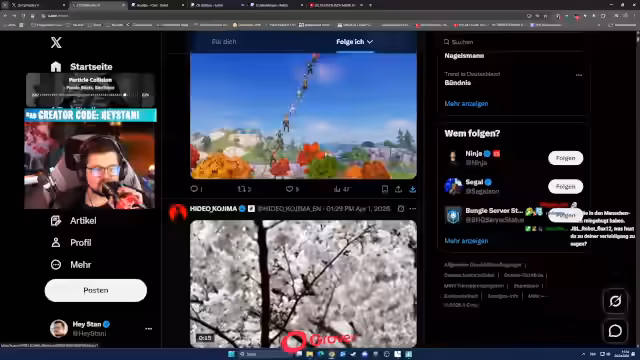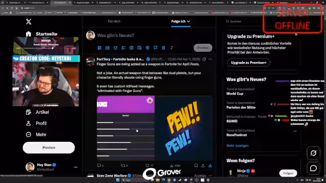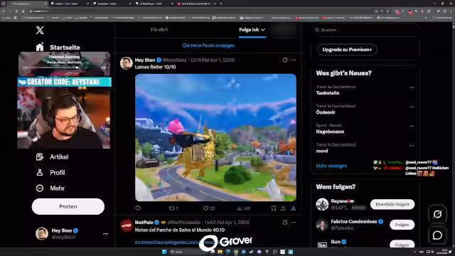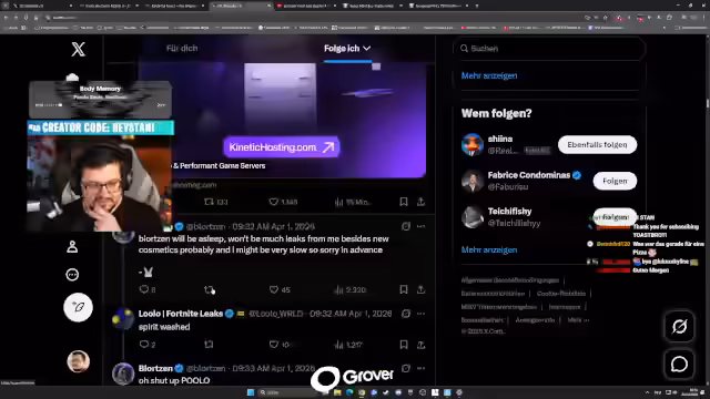 01:32:56Eine überraschende Ankündigung betrifft Donald Mustard. Er soll sein Comeback im Spiel planen, um es zu retten. Die Rückkehr soll am 1. April um 0 Uhr stattfinden, um das Spiel wieder auf den Höhepunkt zu bringen. Der Streamer spekuliert, dass das Update vielleicht auch in den 'Prillshirts' erscheint. Es wird kritisch hinterfragt, ob sein Wirken wirklich Unterschied macht, da auch bei seiner früheren Anstellung bei Epic Games das Spiel abstürzte.