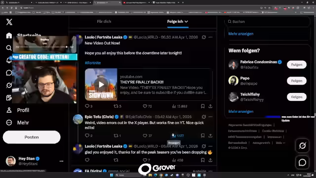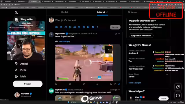 01:39:13Die Server von Fortnite sind für Wartungsarbeiten offline. Um den Zeitpunkt der Rückkehr zu erfahren, werden die Zuschauer angewiesen, das Spiel zu starten. Der Creator Code 'Wutzi' muss dafür eingetippt werden, um ein 'Secret Feature' für 'Creator Supporter' zu aktivieren. Nach ein bis drei Stunden erhält man eine Info, wenn die Server wieder online sind. Die Rückkehr von Donald Mustard wird in diesem Zusammenhang als positives Zeichen für die Zukunft des Spiels gesehen.