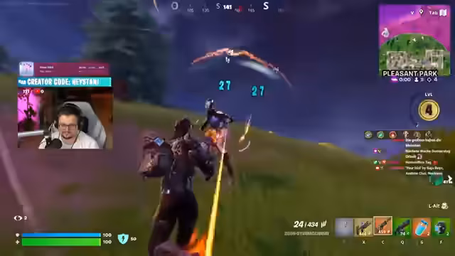 04:03:32Nachdem das Fortnite-Update spielbar war, wurden neue Charaktere und Skins vorgestellt. Es wurde festgestellt, dass einige Charaktere Ähnlichkeiten zu bekannten Figuren aus anderen Spielen haben, wie Volibear aus League of Legends und Winston aus Overwatch. Es gab eine Diskussion über die 'Hotte Boys' im Spiel. Auch im Valorant-Modus wurde gespielt, wobei der Streamer seine Schwierigkeiten ohne Headset erwähnte. Parallel dazu wurde eine Challenge im Chat angekündigt, bei der Stan ein spezielles Top tragen würde, wenn eine bestimmte Anzahl an Spenden oder 'Zaps' erreicht wird.