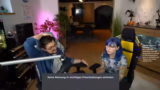 07:32:36Die Streamer führen eine interaktive Challenge durch, bei der sie verschiedene Szenarien bewerten müssen. Sie müssen entscheiden, ob eine Handlung wie 'jemanden nachts abholen' oder 'Massage anbieten' 'Bare Minimum' oder 'Princess Treatment' ist. Die Chatmitglieder werden aufgefordert, per Abstimmung mitzuhelfen und ihre Meinung zu kundgeben. Dieses Format schafft eine engere Bindung zum Publikum und beleuchtet humorvoll Erwartungen in Beziehungen.